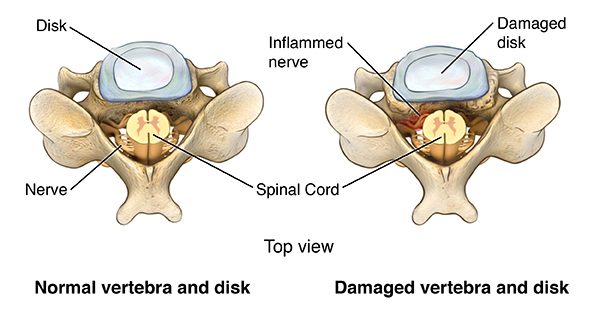The space between your vertebrae becomes too narrow when cervical disks become damaged or worn. Part of your vertebrae or your cervical disk can press on your spinal cord or spinal nerves. This can cause you pain, numbness, or weakness. Disk surgery may be recommended when these symptoms do not respond to nonsurgical types of treatment.