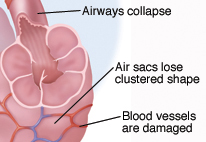 The small airways are damaged and lose their stretchiness. The airways collapse when you exhale. This causes air to get trapped in the air sacs. So less oxygen enters the blood vessels. And less oxygen is delivered to all the cells of your body. This makes it hard to breathe.