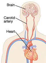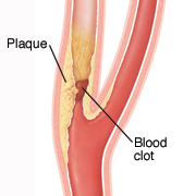 Ischemic stroke occurs when an artery that supplies the brain is greatly narrowed or blocked. This can be caused by a buildup of plaque. It can also occur when small pieces of plaque or blood clot (emboli) break off from the blood vessel or heart into the bloodstream. The emboli flow in the blood until they get stuck in a small blood vessel that limits blood flow to the brain.