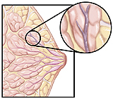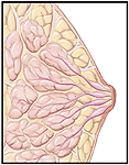 A breast is made of 3 main parts. Lobules make milk. Ducts carry milk to the nipple. Connective tissue is the fibrous and fatty tissue that makes up the rest of the breast. Most breast cancers start in the lobules or ducts.