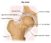 In this condition, the fluid-filled sac (bursa) in the joint becomes inflamed. The bursa functions as a gliding surface to reduce friction between tissues. There are 2 major bursae of the hip. Both can cause stiffness and pain around the hip joint: